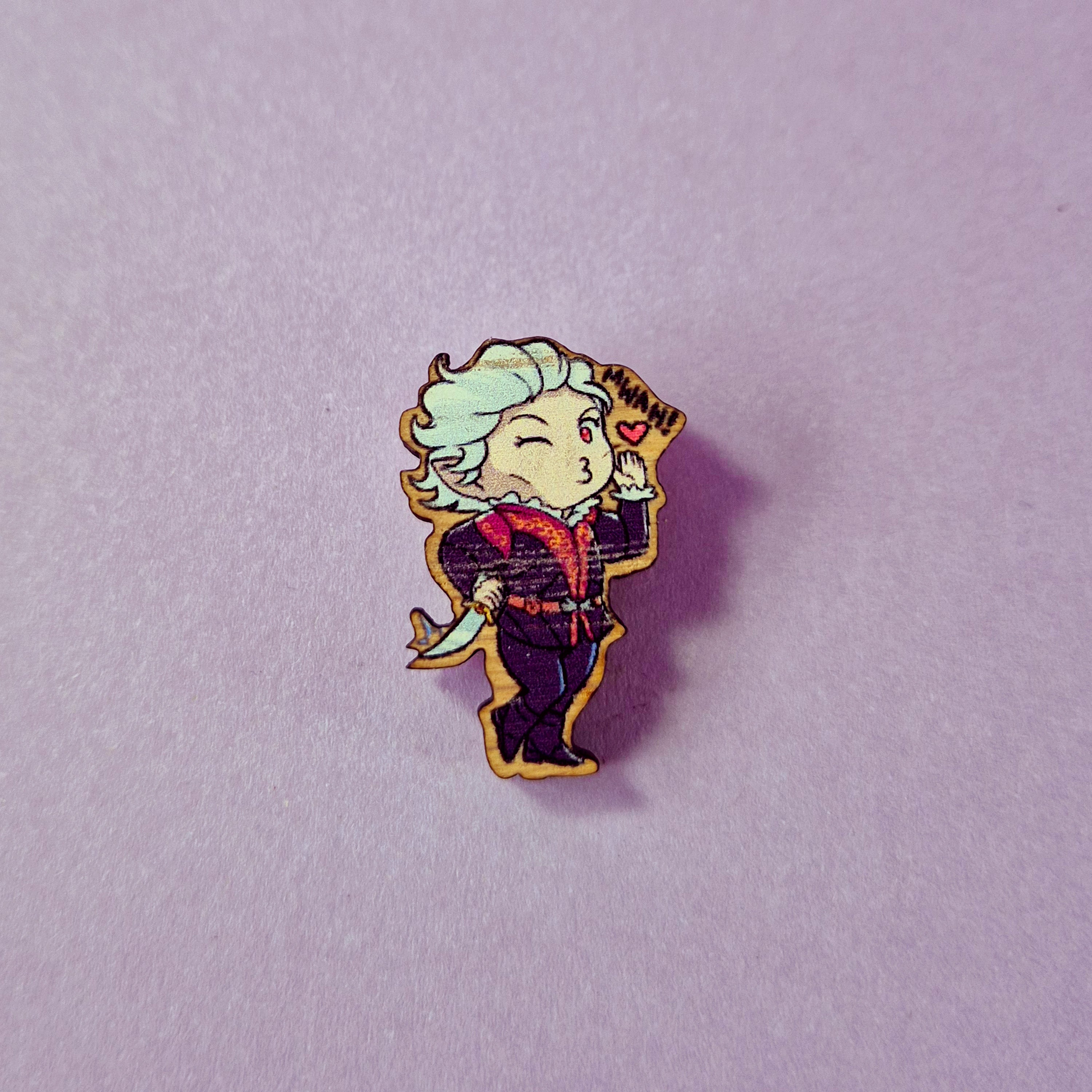 On the one hand, he literally tried to stab you in the back and then to drink your blood while you slept. On the other hand, he’s so pretty and fabulous! How can you stay mad at that face? This pin depicts Astarion flowing a flirtatious kiss while holding a knife behind his back.
