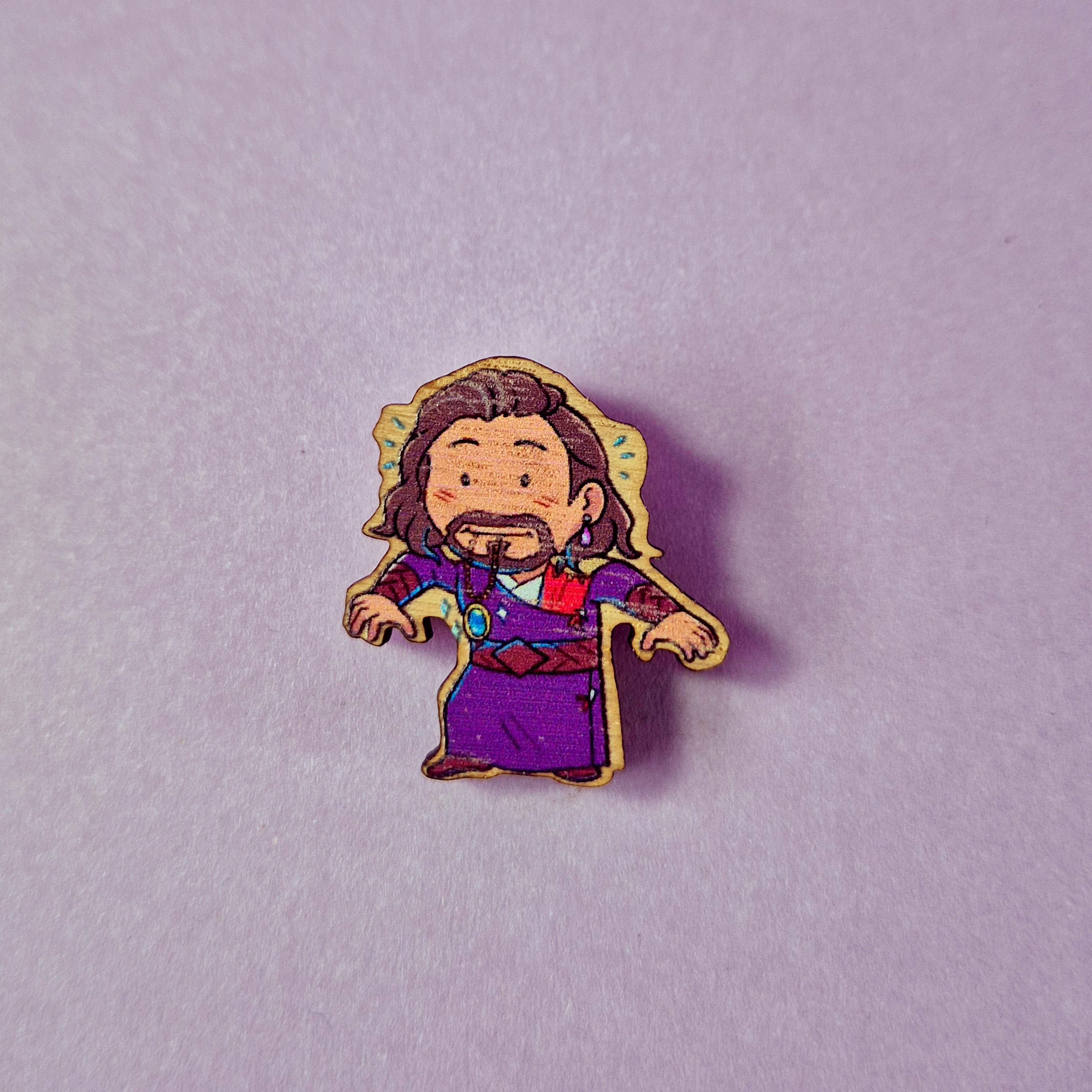 Your favourite Wizard who looks like an eighties pop star and eats your magic items. If you see Mystra, tell her he looks great. This pin depicts a startled Gale, caught in the act with a necklace in his mouth.