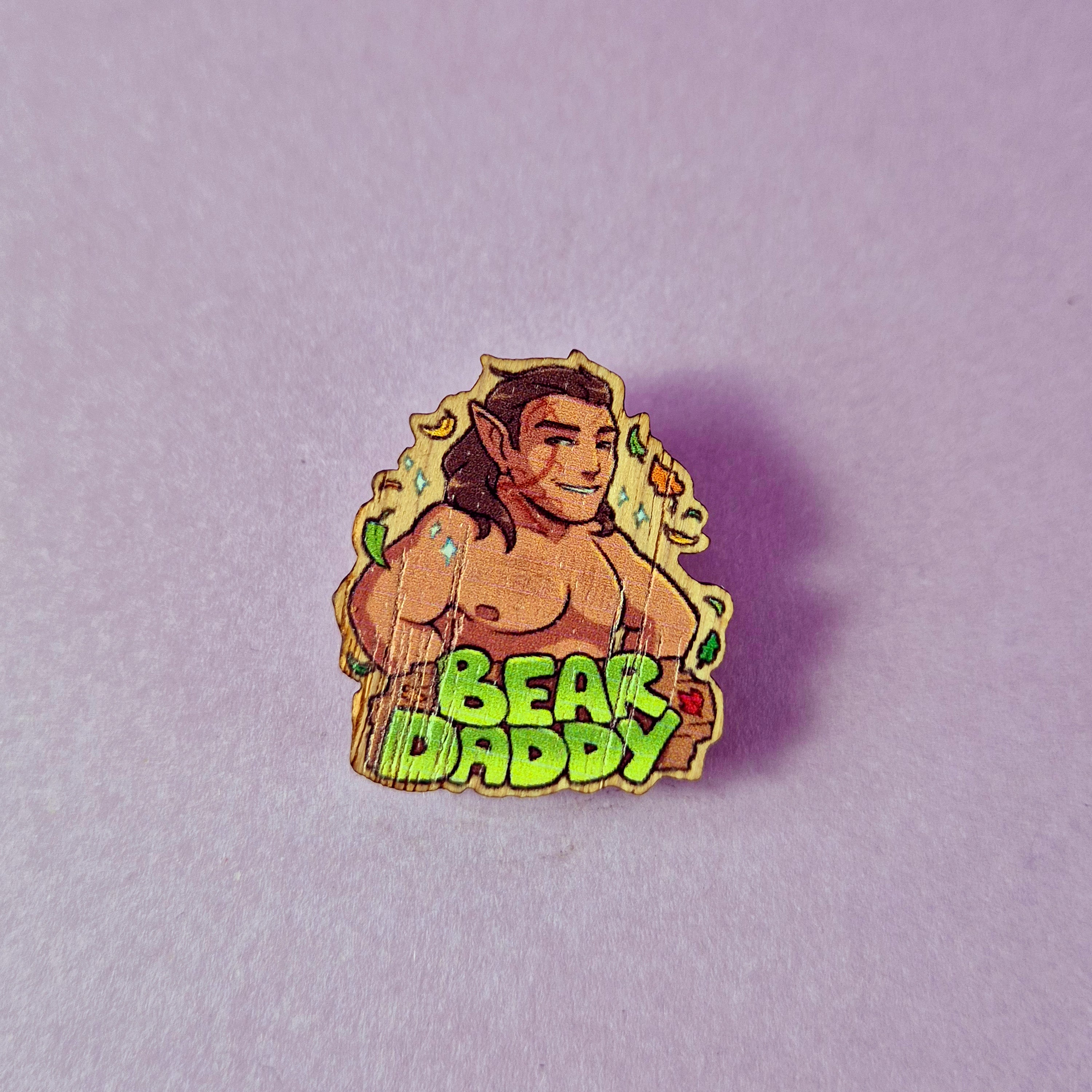 He’s a bear in every sense, he loves honey and he’s transcended social norms about relationships, and that’s beautiful. He is Bear Daddy. This pin depicts the bust of a smiling Halsin and “BEAR DADDY” in big, friendly letters.
