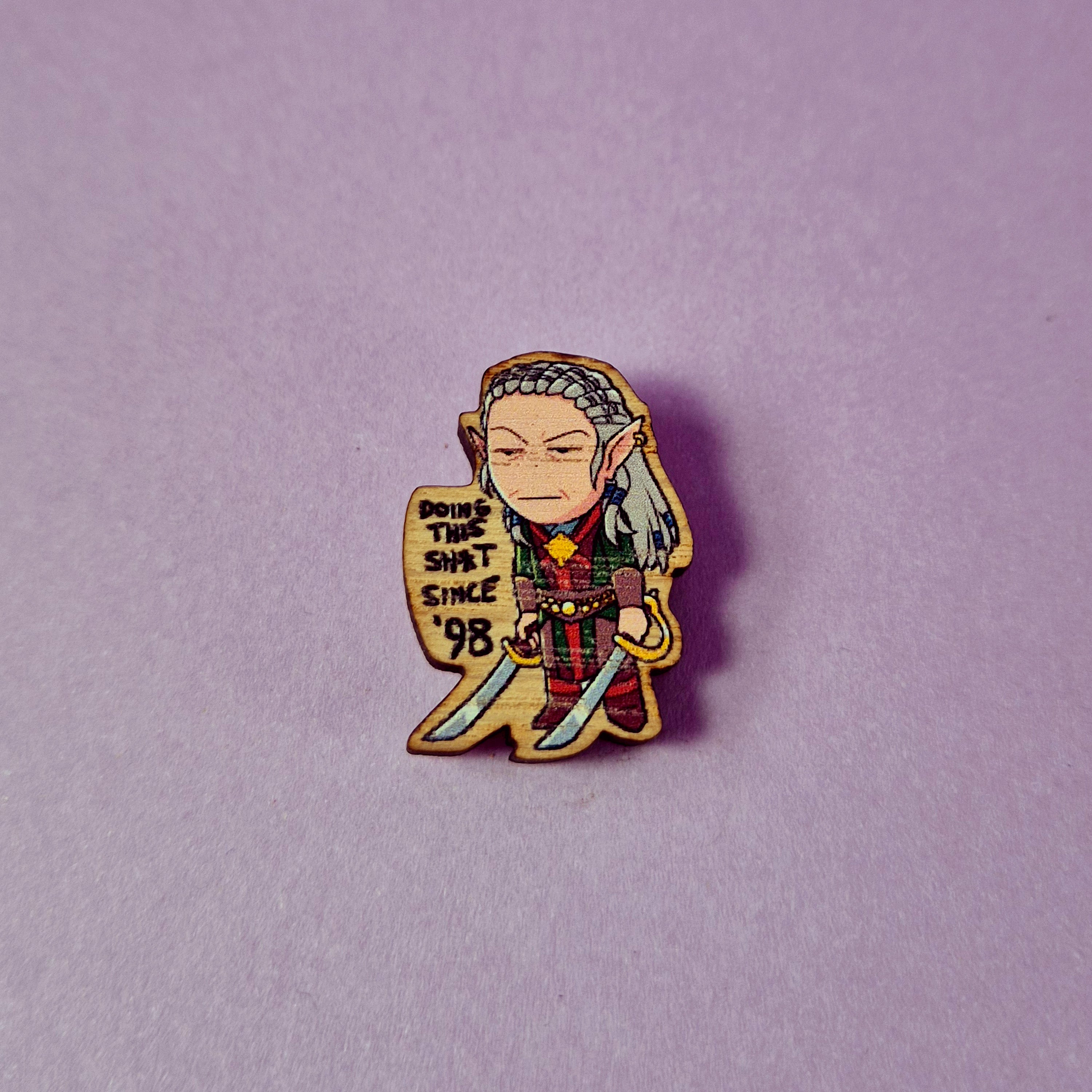 Jaheira was out there casting Entangle on people when these games were isometric! Show some love for a druid whose sassiness can never be eroded by time. This pin depicts a grumpy Jaheira and the words “DOING THIS SH*T SINCE ‘98”.
