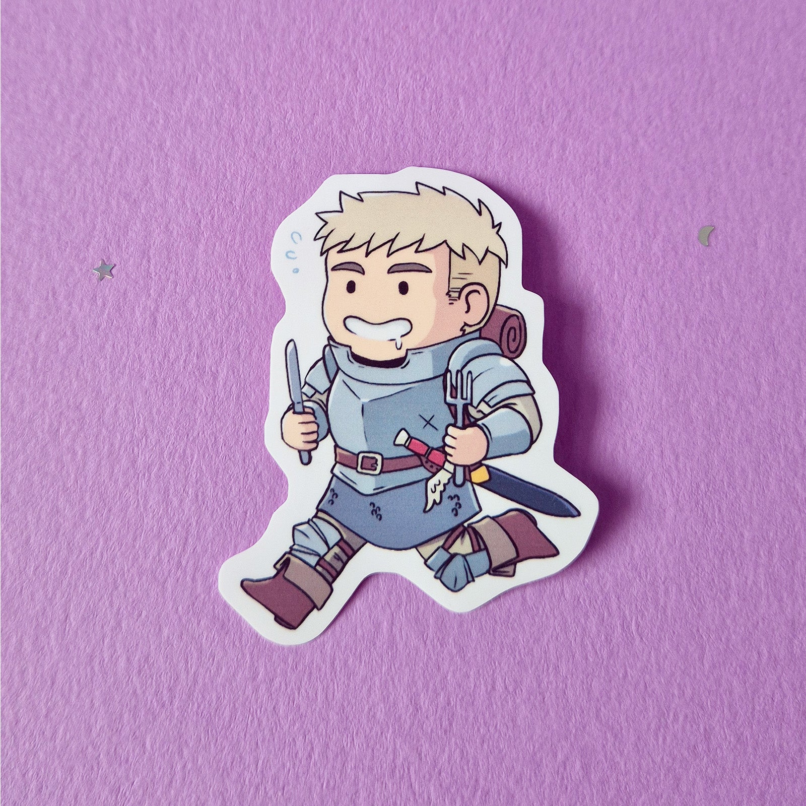 Devoted brother, dog impersonator extraordinaire and the world’s least picky eater, who doesn’t have a soft spot for this wholesome tall man? This sticker depicts Laios excitedly pursuing his next meal, knife and fork at the ready!