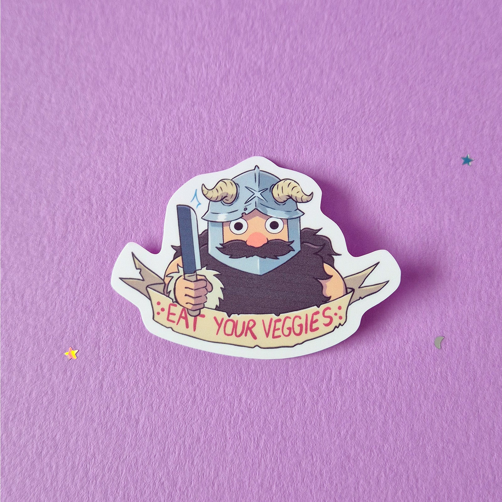 This sticker depicts Senshi staring at you and brandishing his mastercrafted chef’s knife, with the words “EAT YOUR VEGGIES”. You should probably do as he says.