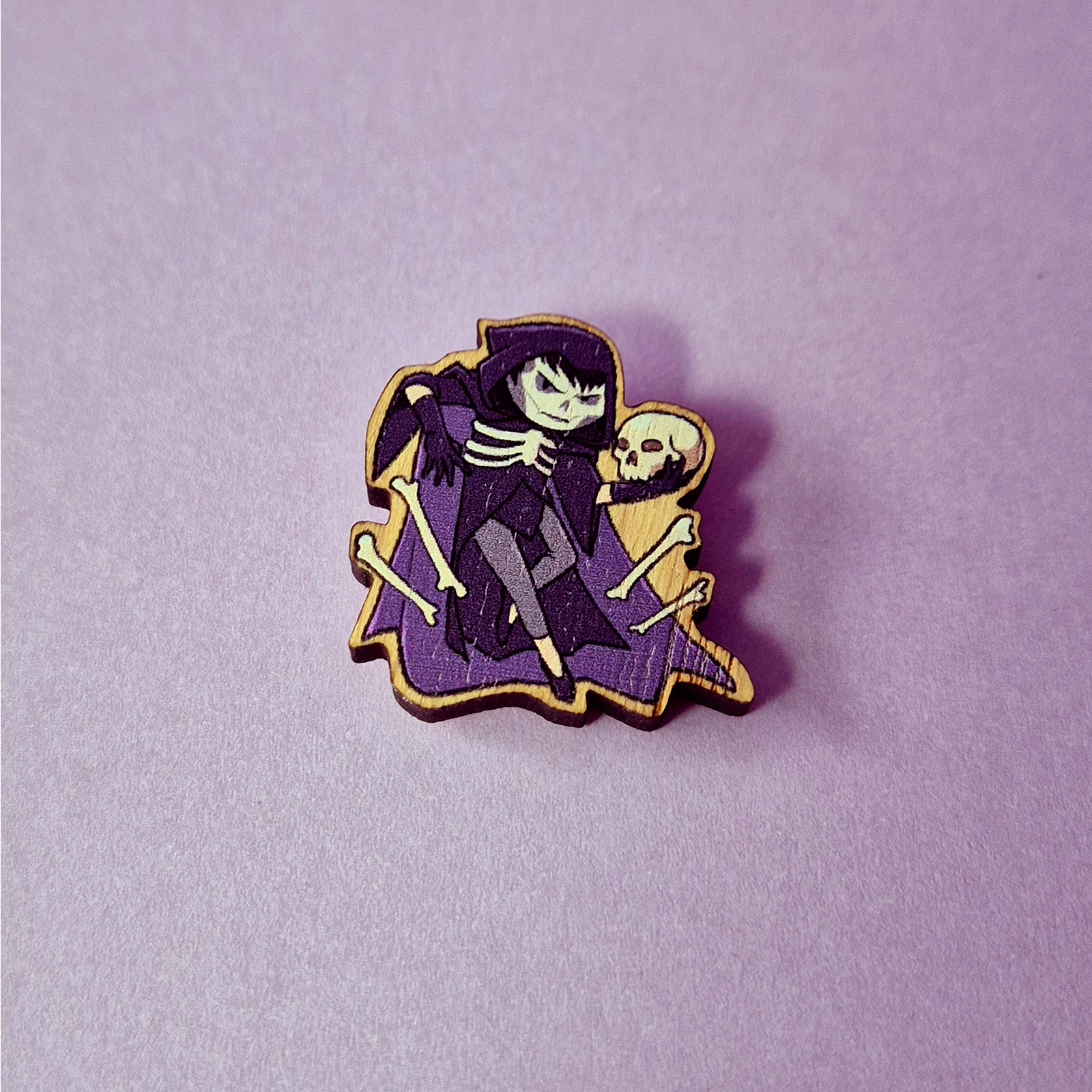 It’s a pin of Harrowhark Nonagesimus, Necromancer of the Ninth. The evilest stick and saddest little meow meow in the solar system, brandishing a skull and a bunch of bones because she’s got to be the most necromantic necromancer possible, that’s her job! Perfect for fans of the Locked Tomb Saga.
