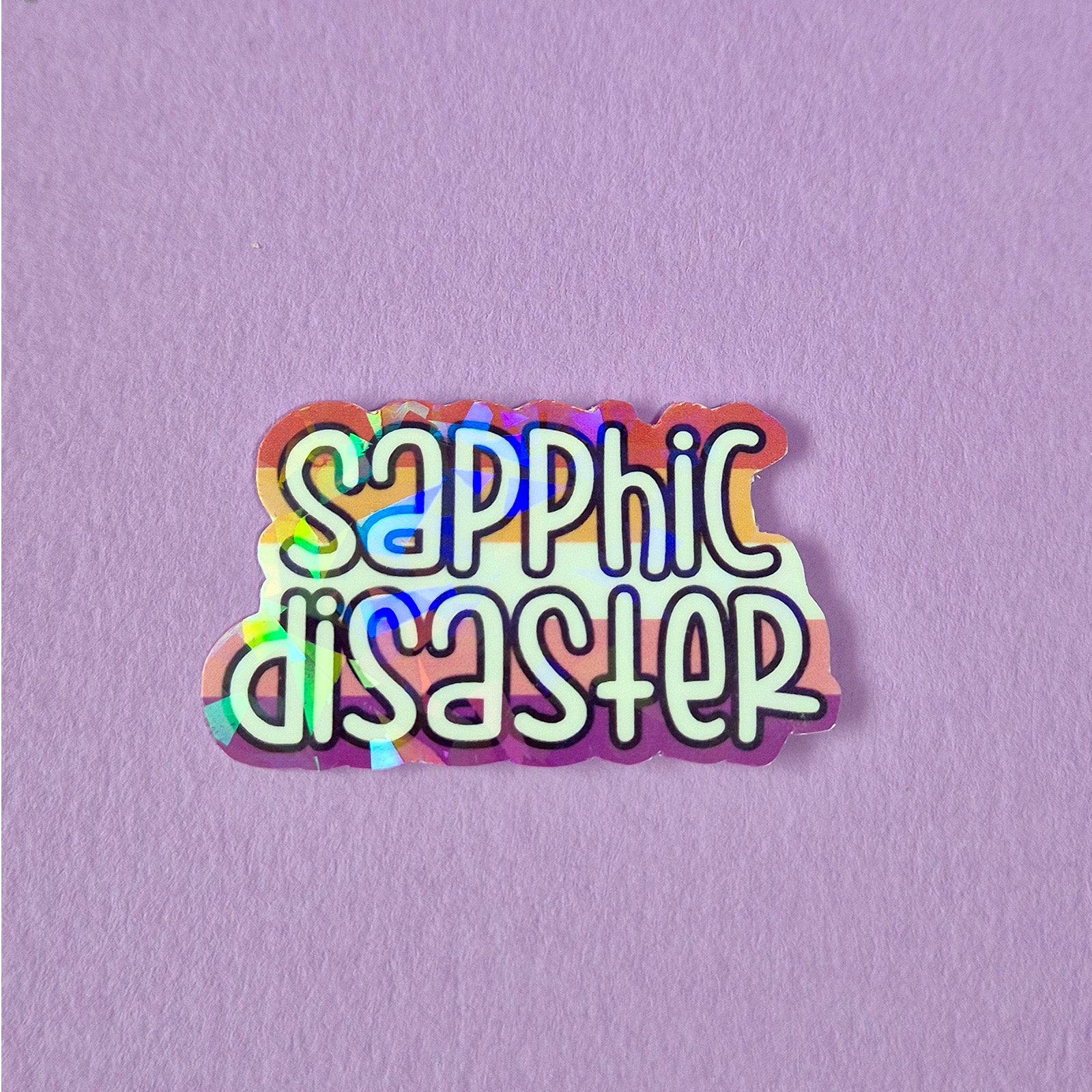 A sticker for people who have a lot of feelings about ladies and lady-adjacent people. Comes in a variety of flag colours because you don’t have to be a cis gold star lesbian to be a sapphic disaster. Our stickers are hand-made with a holographic finish so they’re durable and delightfully sparkly.